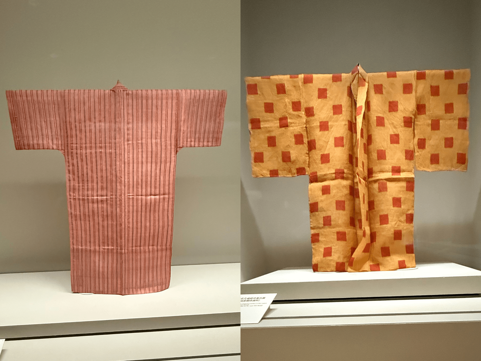 左)国宝桃色地経縞絹芭蕉衣裳〔琉球国王尚家関係資料〕18~19世紀那覇市歴史博物館