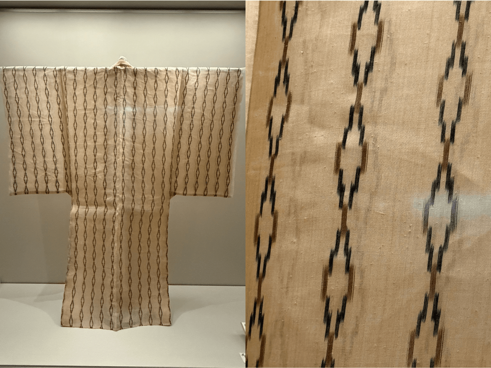 右)国宝黄色地経縞枡形文様絣芭蕉衣裳〔琉球国王尚家関係資料〕18~19世紀那覇市歴史博物館