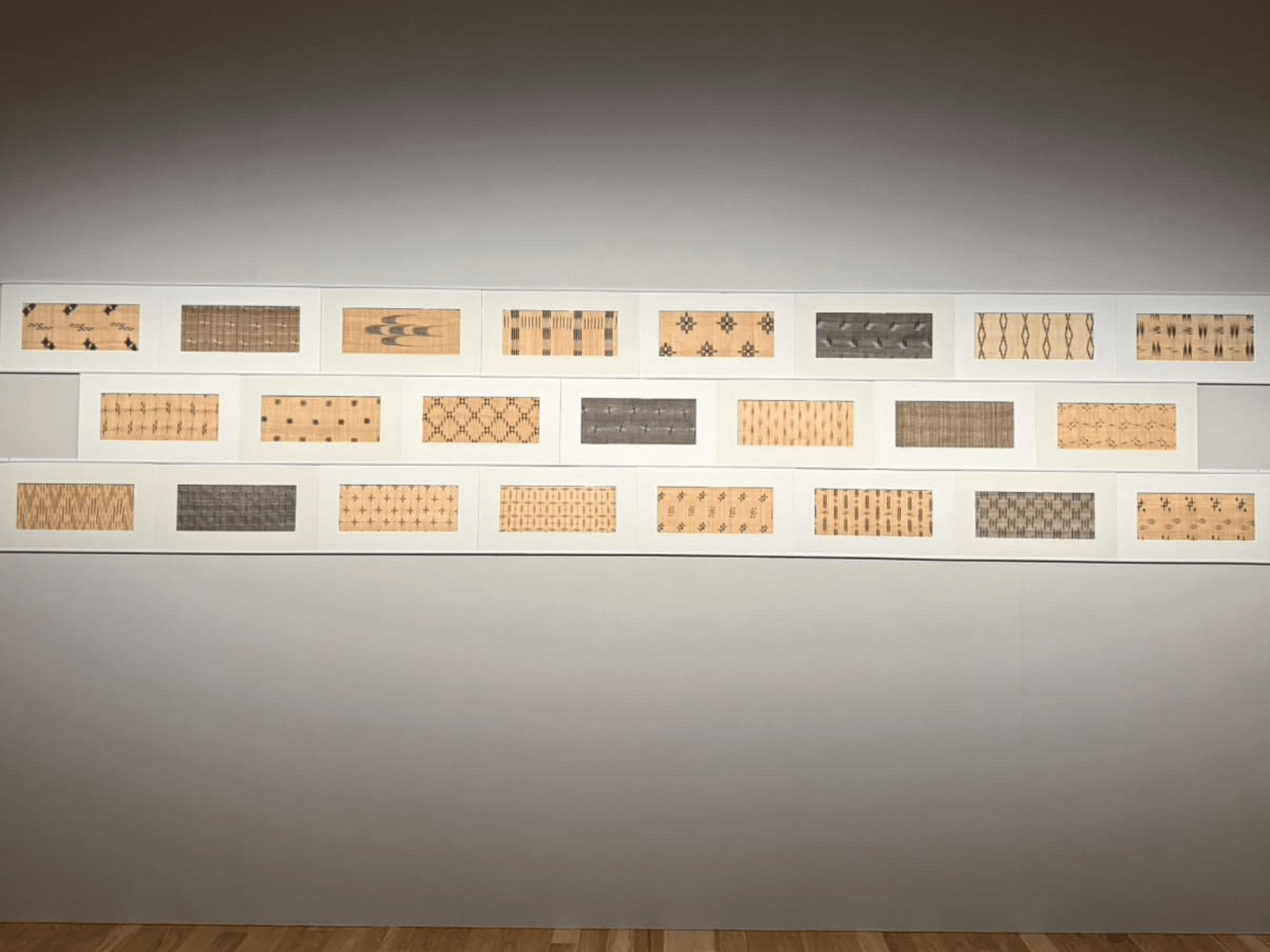 最初の部屋は「第1章 歴史のなかの芭蕉布と文様の美」。王族が身に纏った豊かな色彩と伝統の絣柄の復元に挑んだ平良敏子が開いた芭蕉布工房の作品が並びます。国宝に指定された王族の着物は、緋色や黄色の地に枡形や菱の文様がびしっと織り込まれ、堂々たる存在感。「沖縄って、こんなに鮮やかで力強い文化を持っていたんだ」と改めて実感します。