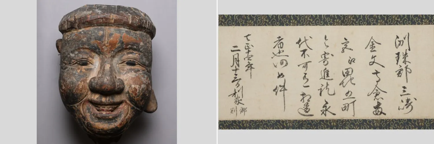 「輪島・住吉神社ゆかりの宝物」では、住吉神社に伝わった仮面や懸仏(かけぼとけ)、仏像といった貴重な文化財を紹介。特に、室町時代の「鼻高面」や室町~江戸時代の「大黒天像 頭部」など、住吉神社の歴史を今に伝える貴重な彫刻作品が展示され、過去の災難に耐えて引き継がれてきた宝物の数々を観覧することができます。