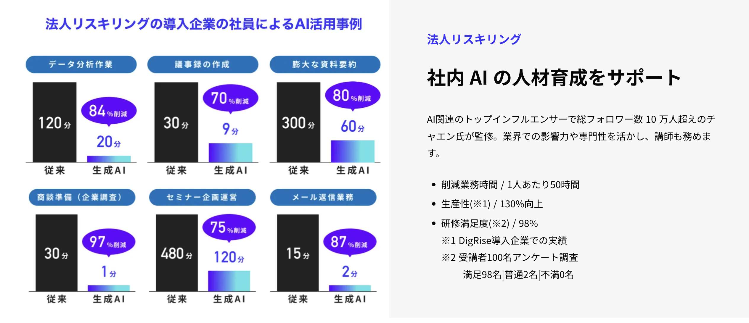 また大きな魅力の一つが、日本の生成AI活用を牽引する茶圓(チャエン)氏が指導・監修を務めること。ただ使い方を教えてくれるのではなく、「業務改善と成果にどうつなげるか」という視点で設計された研修が受けられ、たとえば「議事録の自動作成」「営業資料の下書き」「社内FAQの整備」など、明日から使える活用事例が多数紹介されます。
