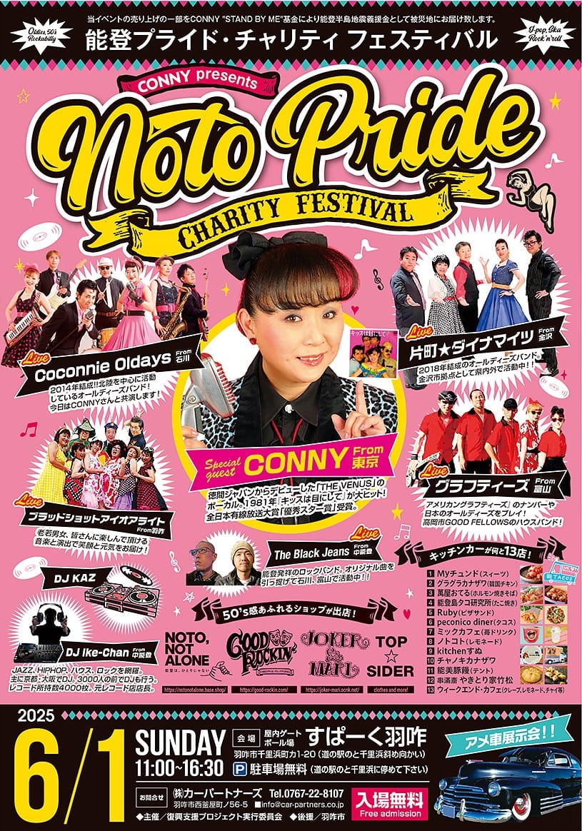 イベントの売り上げの一部は、CONNY “STAND BY ME”基金を通じて能登半島地震の義援金として被災地に届けられます。音楽を楽しみながら、能登の復興を応援できるこの機会に、ぜひ足を運んでみてはいかがでしょうか。
