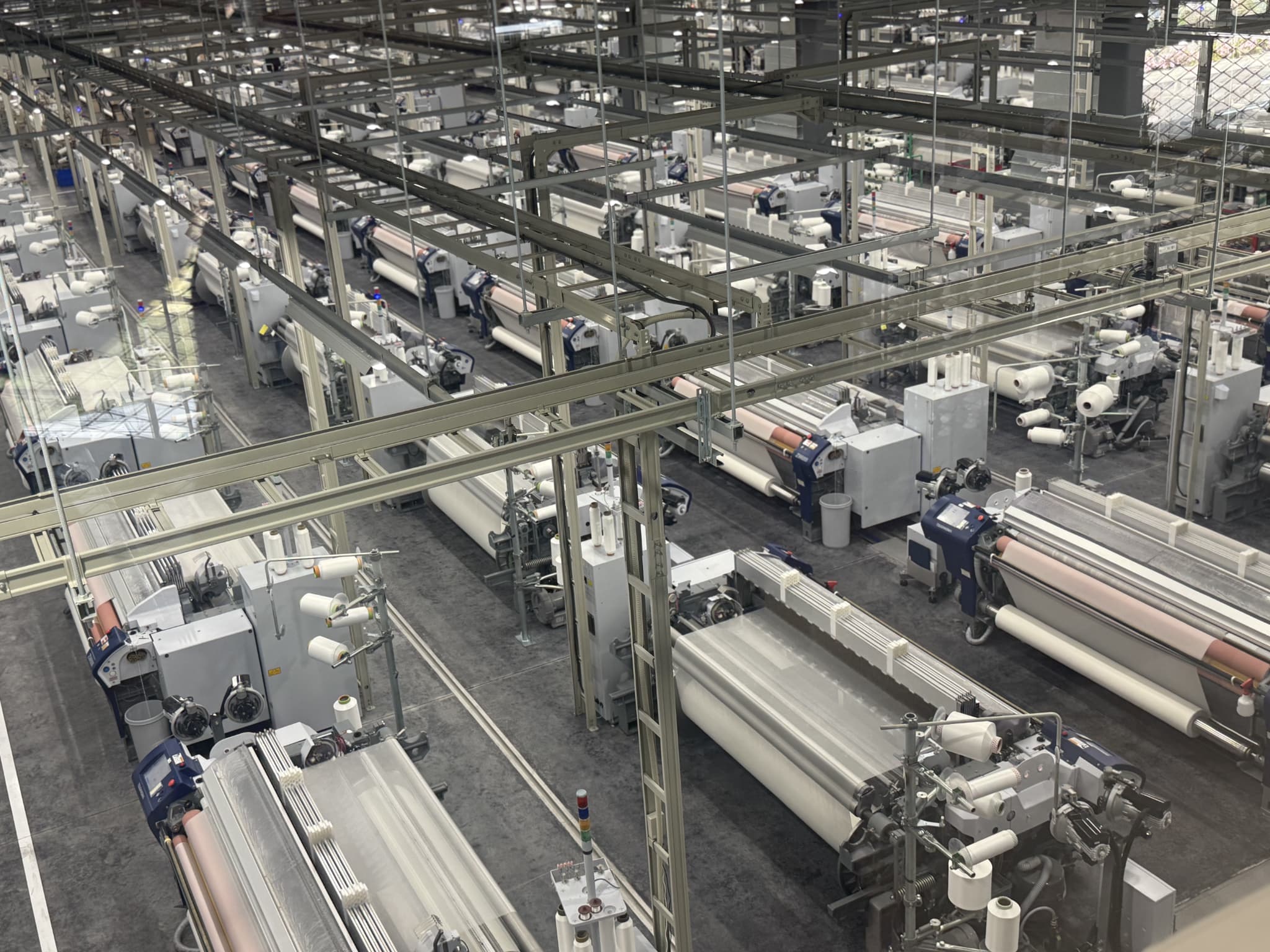 そびえ立つ壁のように整然と並ぶ真っ白な糸巻きに挟まれた階段を登っていくと、柔らかな布が出迎えてくれます。