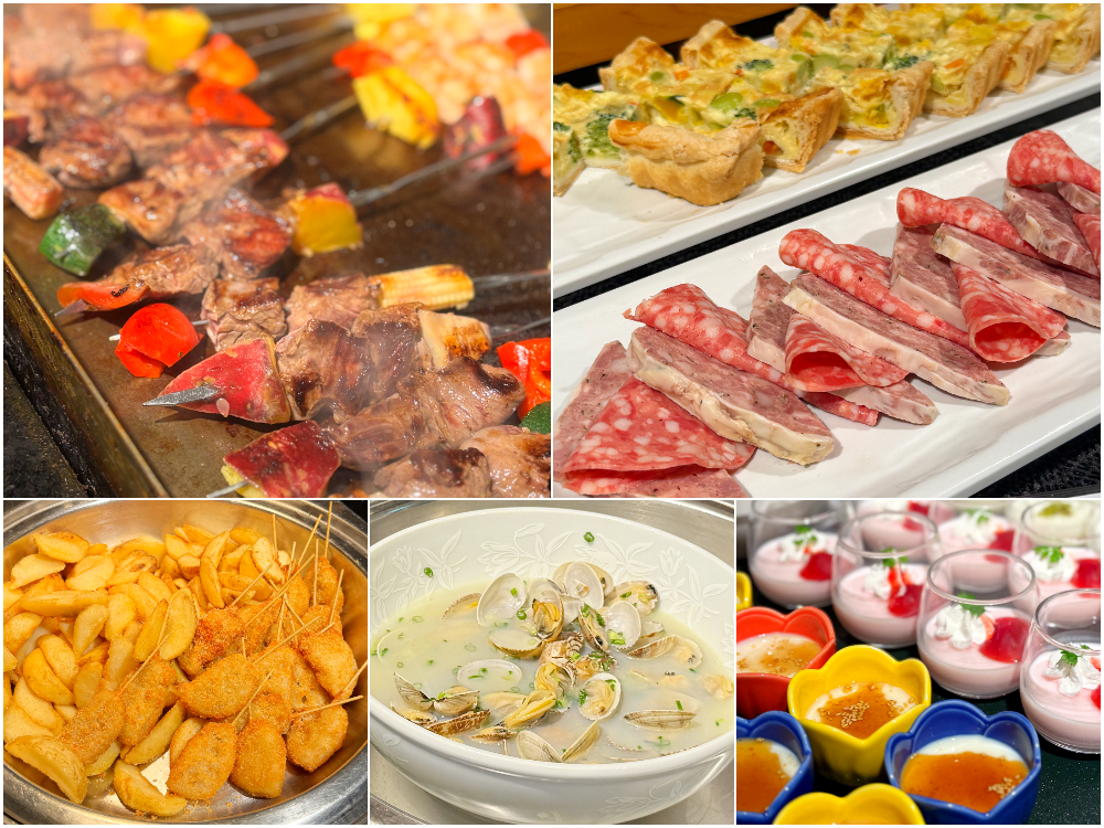専属シェフが目の前でジュウジュウと焼き上げてくれるのは大きめにカットした豚肉、海老、牛肉をメインに、パプリカやズッキーニなどの彩り野菜を配した3種類。香ばしい香りに食欲が刺激される。