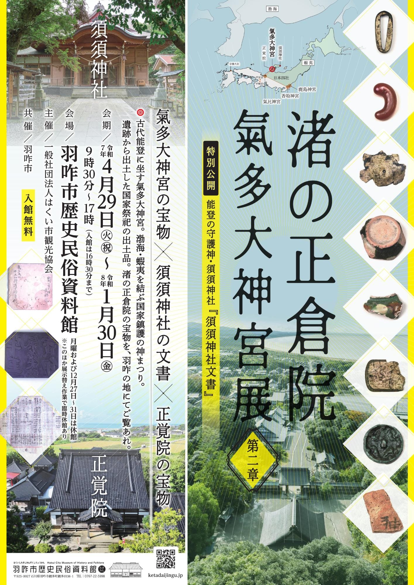 その氣多大神宮と周辺の寺家遺跡に焦点を当てた企画展「渚の正倉院 氣多大神宮展 第二章」が、羽咋市歴史民俗資料館にて開催されています。