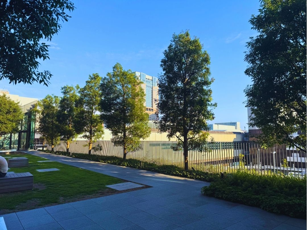 窓の外にはクロスゲート金沢の屋上庭園「みらいの丘」が。
