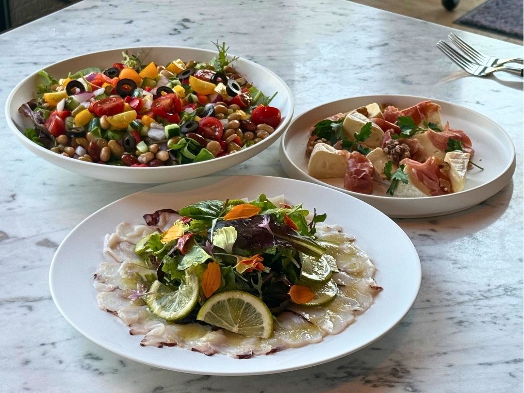 まずは運ばれてきたのが「水タコのカルパッチョ ライムのヴィネグレット」、「チョップドサラダ」、「スペイン産ハモンセラーノ カマンベールチーズ クルミのロースト」という前菜3皿。ライムの香りが爽やかなタコカルも、絶妙な塩気の生ハムもお酒との相性抜群!