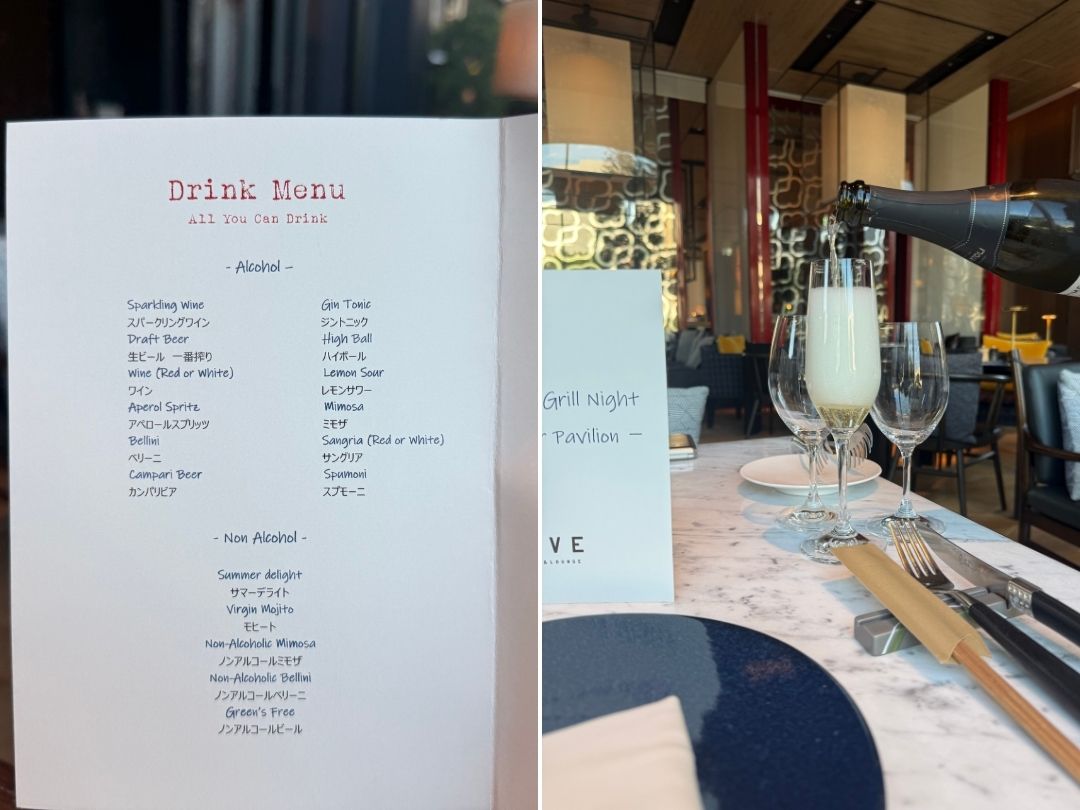 飲み放題のドリンクは、アルコール12種類、ノンアルコール5種類から選べたので、一番上のスパークワインから順に攻めることにした。