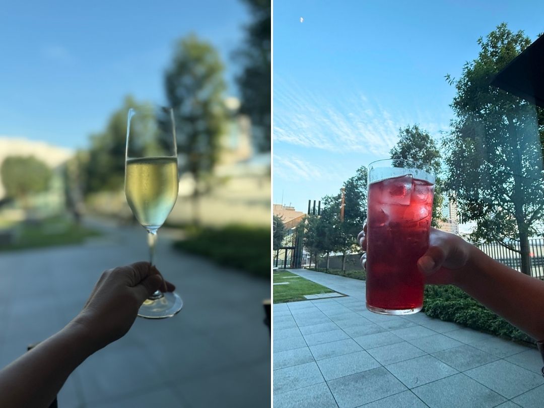 まだちょっぴり恨めしげな裏番長に「これ可愛くて美味しそうで裏番さんに似合いですよ!」とノンアルコールカクテルを注文。我ながら、気遣いのできる後輩である。(空に映える色のドリンクが撮れて良かった)