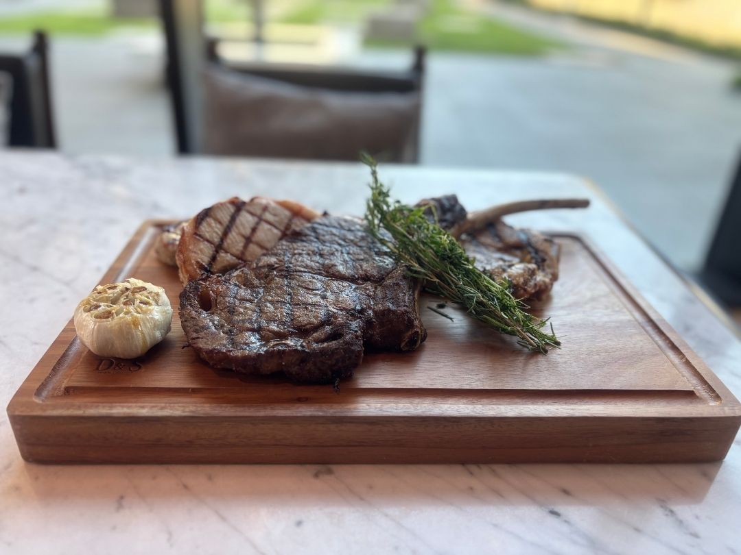 トマホーク(斧)の名に恥じない、圧倒的な存在感の骨付き肉「オーストラリア産ブラックアンガス牛のトマホーク」、その左右には能登豚と桜姫鶏のローストが置かれている。