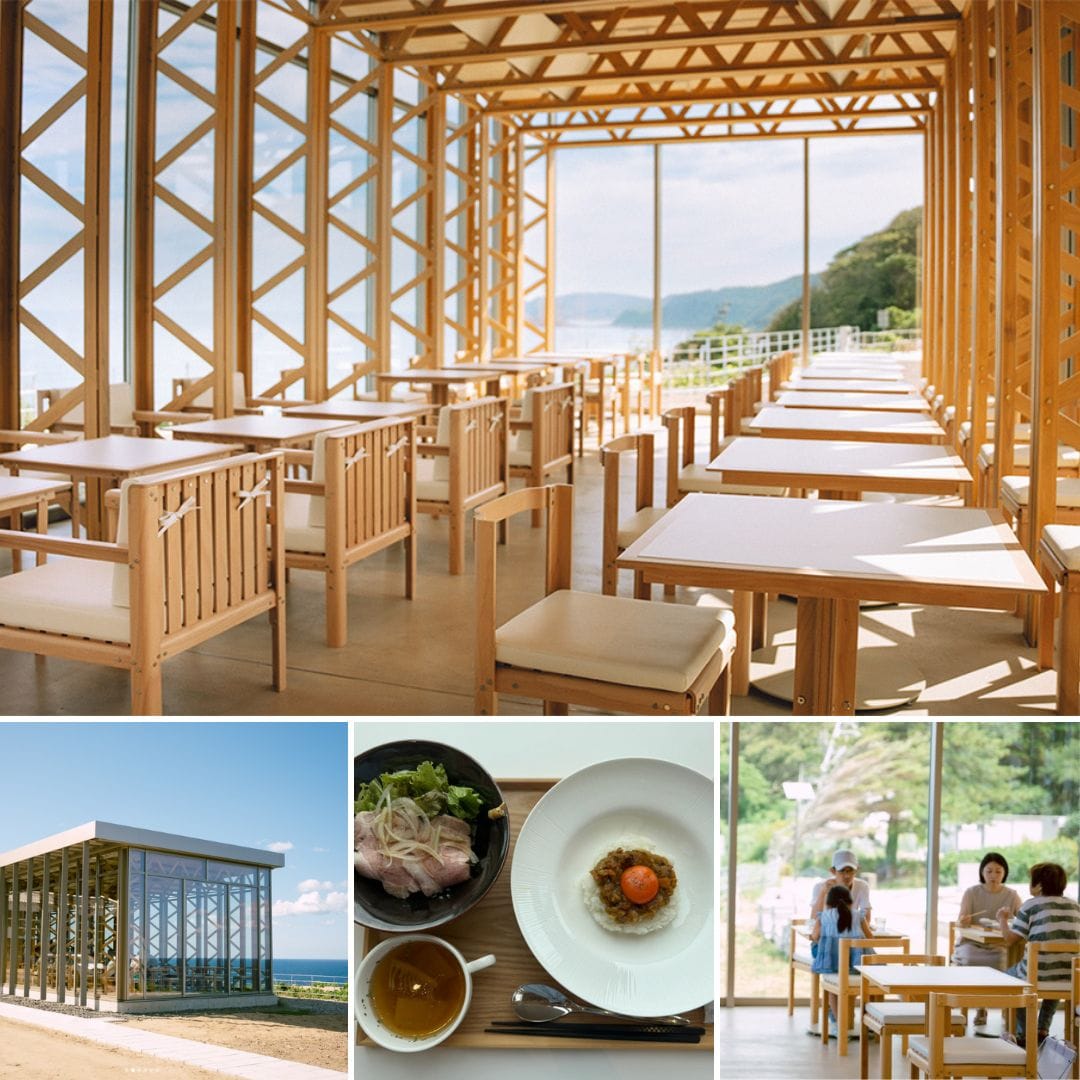 世界的建築家・坂茂氏が設計を手がけ、どの席に座っても奥能登の外浦の壮大な景色を一望できるのが最大の魅力です 。大きな窓から光が差し込む開放的な空間で、まるで海に浮かんでいるかのような感覚を味わえます。
