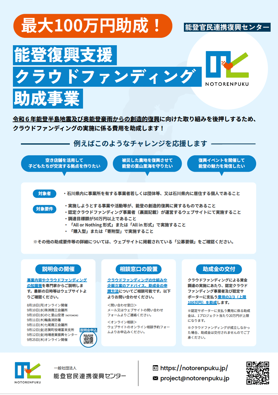 そうしたなか、「一般社団法人 能登官民連携復興センター」では、地域団体や事業者がクラウドファンディングに挑戦する際の費用負担を軽減する支援事業を実施しています。クラファン実施時に必要となるプラットフォーム利用料や、プロジェクトページの作成費用などに対し、最大100万円の助成が受けられるというものです。