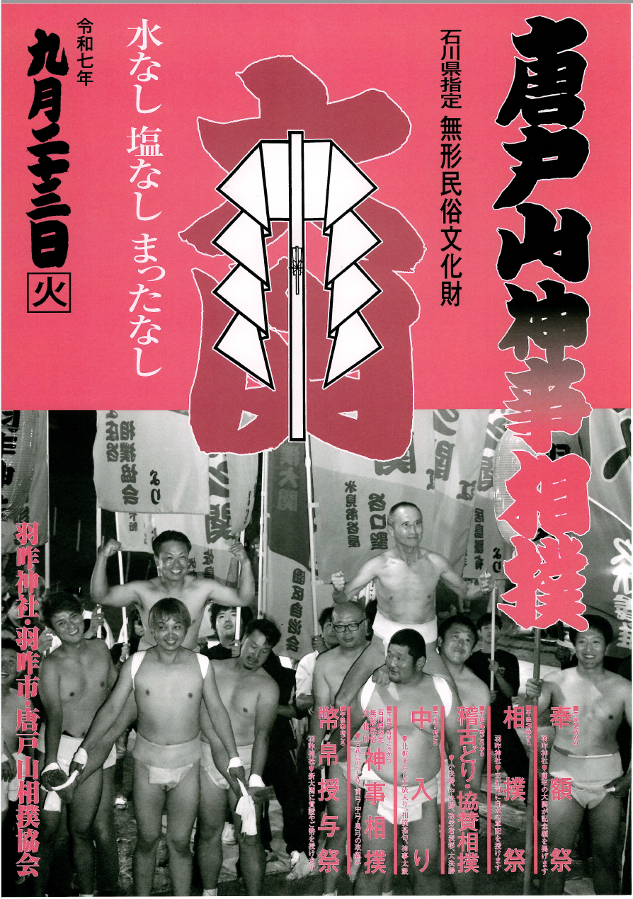 「水なし、塩なし、待ったなし」迫力と感動の神事相撲。地元の歴史と文化が息づく、秋の風物詩。相撲好きであったといわれる羽咋神社の祭神・磐衝別命(いわつくわけのみこと)の遺徳をしのんで、行われている相撲です。また、商店街にて地元商店や露天商が集まり、夜店が軒を連ねます。相撲が好きな方はもちろん、まだご覧になったことがない方も、皆様でお楽しみいただけます。