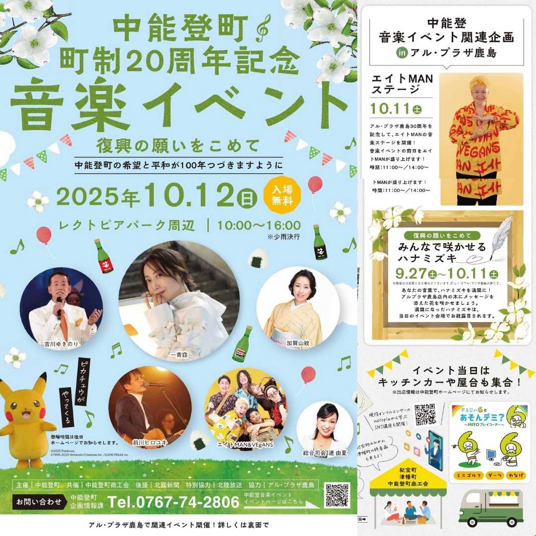 石川県中能登町では、町制20周年と復興元年を記念し、2025年10月12日(日)に音楽イベントを開催します。会場は『レクトピアパーク』周辺です。
