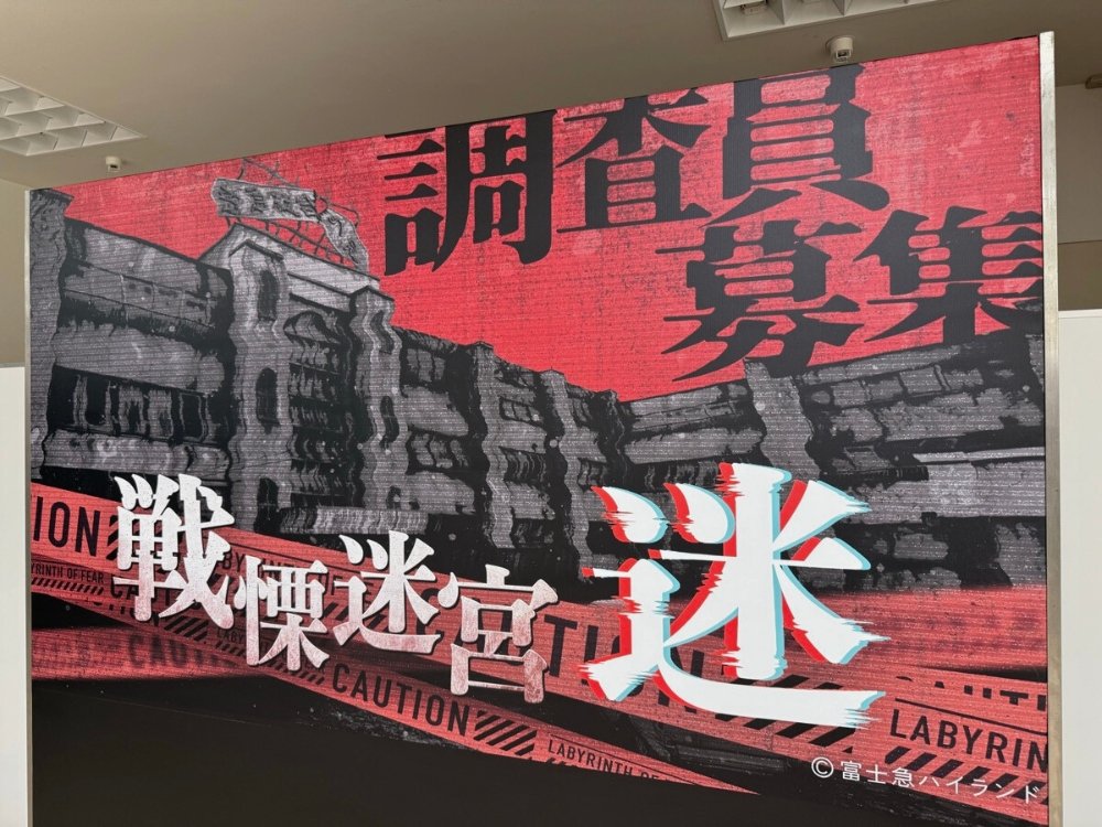 会場はクラソ・プレイス香林坊。館内に入ってエスカレーターで3階へ向かう途中、いつもの買い物動線のはずなのに、目的地が“戦慄迷宮”だと思うと気持ちがそわそわしてきます。3階に到着すると、大きな「戦慄迷宮:迷」のパネルが目に入るので、迷わず会場にたどり着けるのも助かりました。案内に従って進むだけなのに、入口が近づくほど妙に落ち着かなくなっていきます。