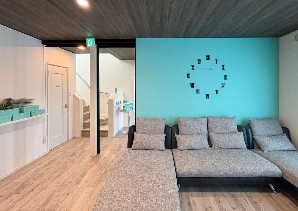 2024年春に改装した「nalu_west」は、ミントグリーンを基調とした明るい内装が印象的。建物内は禁煙で、1階には広々としたリビングダイニングとキッチンがあり、食器や調理器具も完備。地元で購入した食材を自由に持ち込んで、ホームパーティーを開くもおすすめだ。