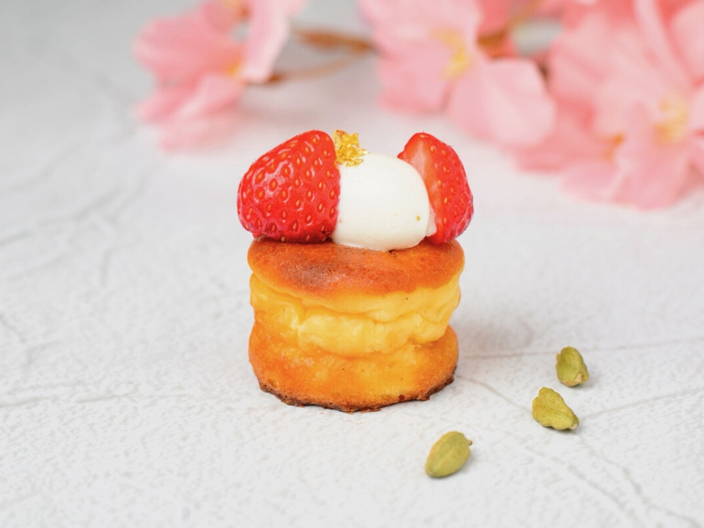 「カルダモン香るバスクチーズケーキ」を口にした瞬間、少し身構えていた気持ちがほどけました。浮いてしまうかもしれないと思っていたスパイスが、いちごの甘さをくっきりと際立たせていたからです。チーズの濃厚さのあとに、すっと抜けるグリーンカルダモンの香り。その余韻があるからこそ、いちごの甘みがよりくっきりと感じられる。スパイスが主役になるのではなく、いちごをより“いちごらしく”見せている。そこに、このアフタヌーンティーの意図があるように感じました。