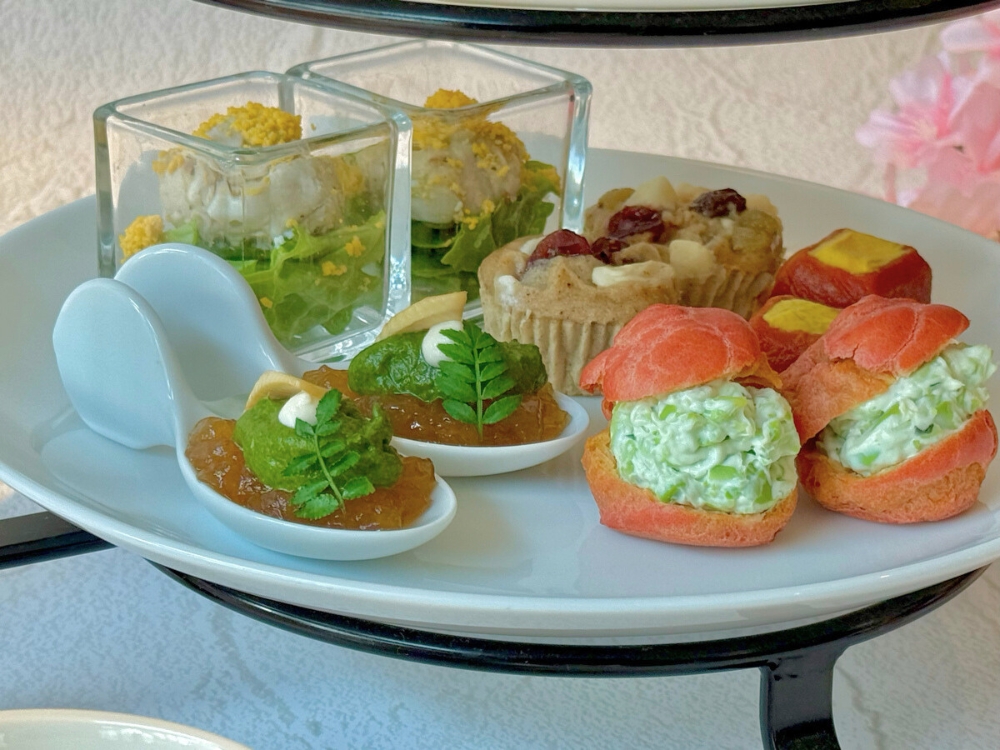 セイボリーも抜かりありません。ローストポークのミモザ仕立て、たけのこのコンソメジュレとアイヌ葱のピュレ、バジル香る枝豆チーズのシュー、桜鯛の桜葉マリネ。春の食材を取り入れた軽やかな構成。中でもパプリカ香る鶏レバームースのタルトは、しっかりとした旨みがあり、甘いものの合間に口の中をいい具合に切り替えてくれました。