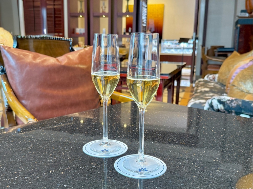 着席するとまず運ばれてきたのが、ウェルカムドリンク。グラスに注がれた黄金色の飲み物を見て、少し動揺しました。どう見てもシャンパンです。でも実はこれ、ロンネフェルトティー「アールグレイ」のティーソーダ。口に含むと、しっかりとした甘さの中に茶葉の香りがふわっと広がり、かなり好みの味でした!なお、追加料金でスパークリングワインに変更することもできます。