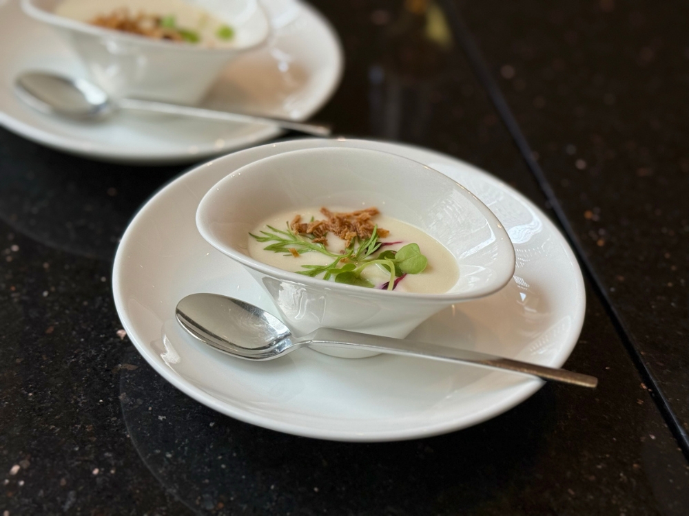 セイボリーも充実しています。「新玉葱のヴルーテ」は、新玉葱の甘みをやさしく引き出したスープ仕立てで、アフタヌーンティーの始まりにぴったりの一杯。