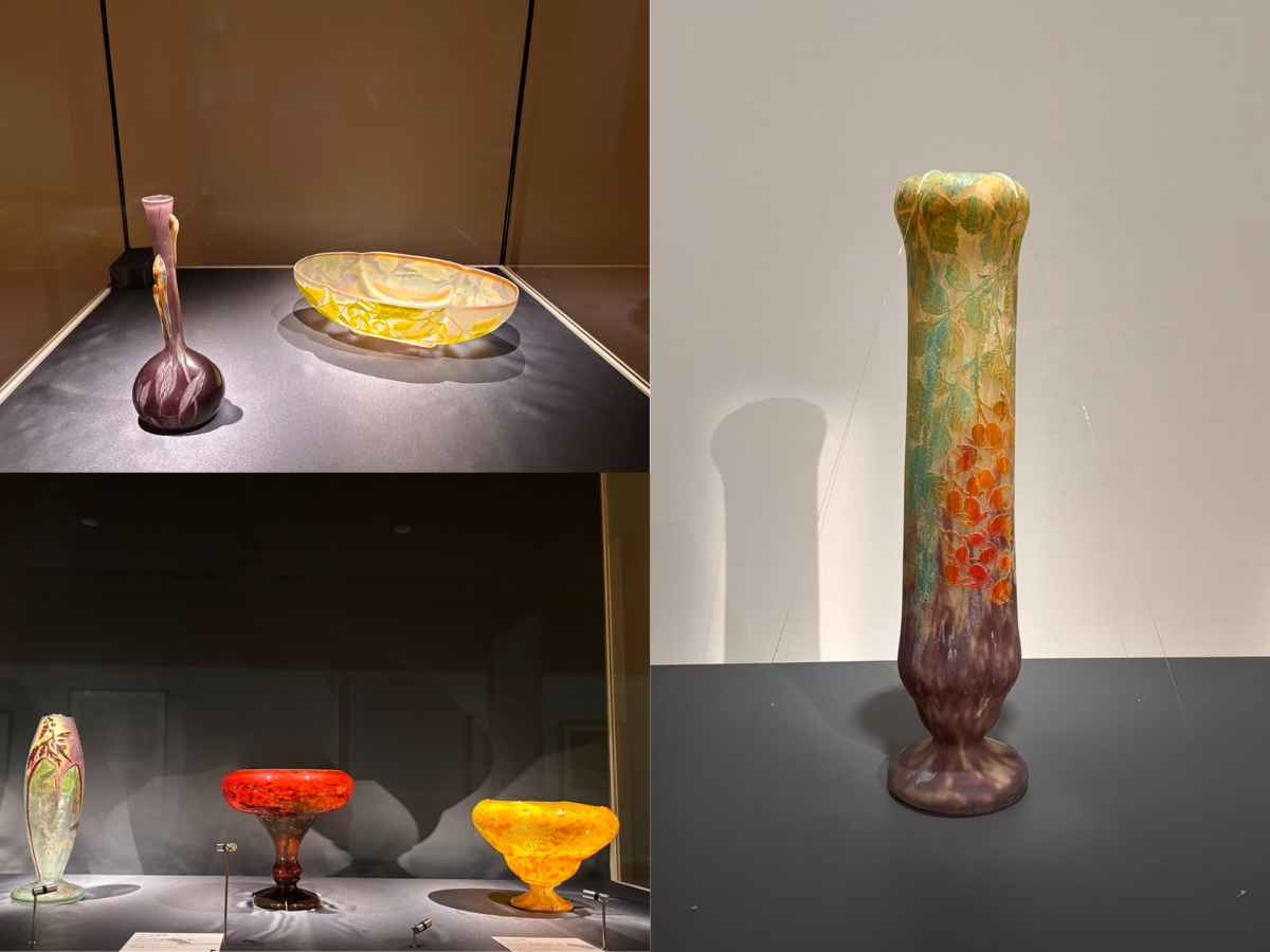 左上:エミール・ガレ《イヌサフラン文鶴頸花瓶》1900年/エミール・ガレ《トネリコバノカエデ文鉢》1903年/左下:左から ドーム兄弟《藻魚文花器》1898年、ドーム兄弟《マーブル地脚付杯(赤)》1910年代、ドーム兄弟《マーブル地脚付杯(黄)》1910年代/右:ドーム兄弟《野バラ文花瓶》1914〜1920年頃 以上、すべて国立工芸館蔵
