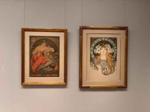 アルフォンス・ミュシャ《民衆美術協会》1897年/アルフォンス・ミュシャ《サラ・ベルナール》1896年 以上、すべて国立工芸館蔵