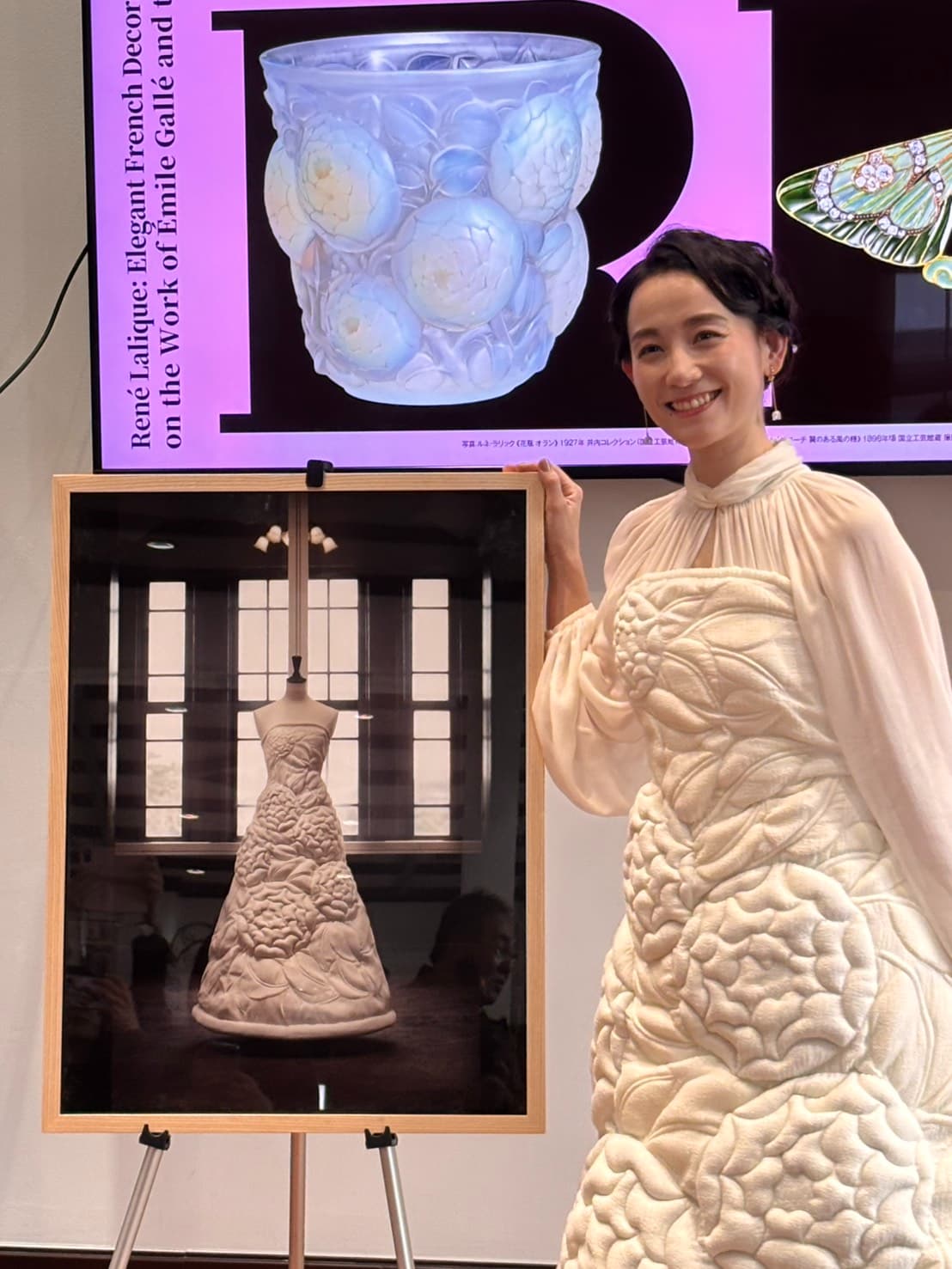 そのドレスは会期中、会場内に写真で展示されます。ラリックの《花瓶 オラン》と篠原さんのドレスの両方を楽しんでください。感性と技術による「時代を超えた対話」が感じられます。なお、篠原さんは、会場限定で上映されるラリック紹介映像のナレーションも担当されています。
