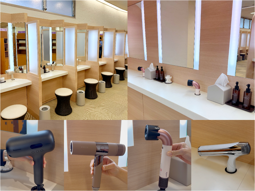 目玉のサウナリニューアルにはびっくりしたり、納得したりでしたが、実は細かい部分もリニューアルと工夫がなされていました。女性エリアでは、混雑時でもスムーズに利用できるように、洗面台の数がしっかり増設されたそう。脱衣所には、人気の高級ドライヤー(KINUJO、ReFa、Panasonic、Dyson)が無料で使えます。