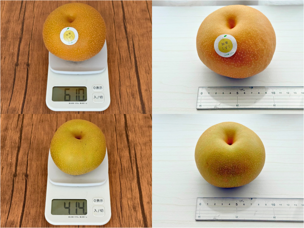 この大きさが伝わるでしょうか。僕は想像以上の大きさにびっくりしました。一般的な梨が400g前後なのに対して、加賀しずくは平均600g。