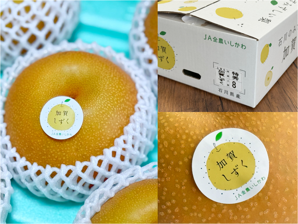 加賀しずくは「幸水」と「鞍月」という梨を掛け合わせて生まれた品種。石川生まれで美味しいけど栽培が難しい「鞍月」を、美味しさはそのままで栽培がしやすいように改良を続け、16年の歳月をかけてようやく完成したそうです。 2016年に品種登録され、2017年にデビューした、新しいブランド梨です。