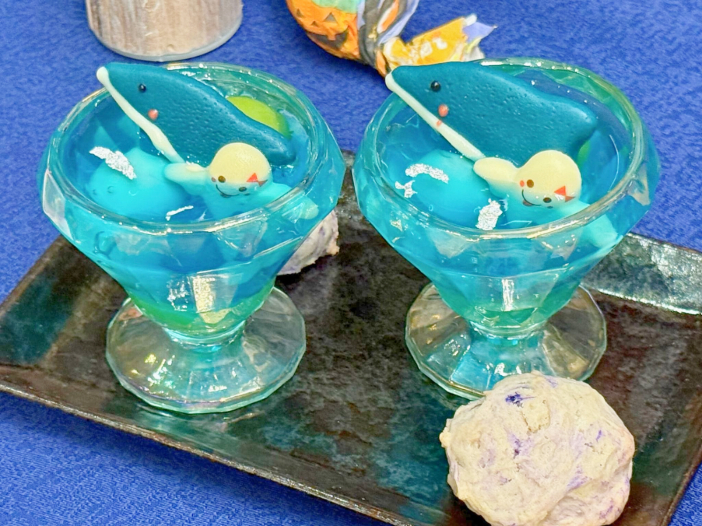 思わず写真を撮りたくなる光景がありました。幻想的な夜の水族館とハロウィンの組み合わせなんて、見たことがありません。ジャックオランタンをくわえたジンベエザメのマカロン、浮き輪に乗って遊ぶマゼランペンギンのグリオットチェリームース、かぼちゃ色の甲羅を付けたアオウミガメのムース、そして求肥をまとったおばけクラゲ…。