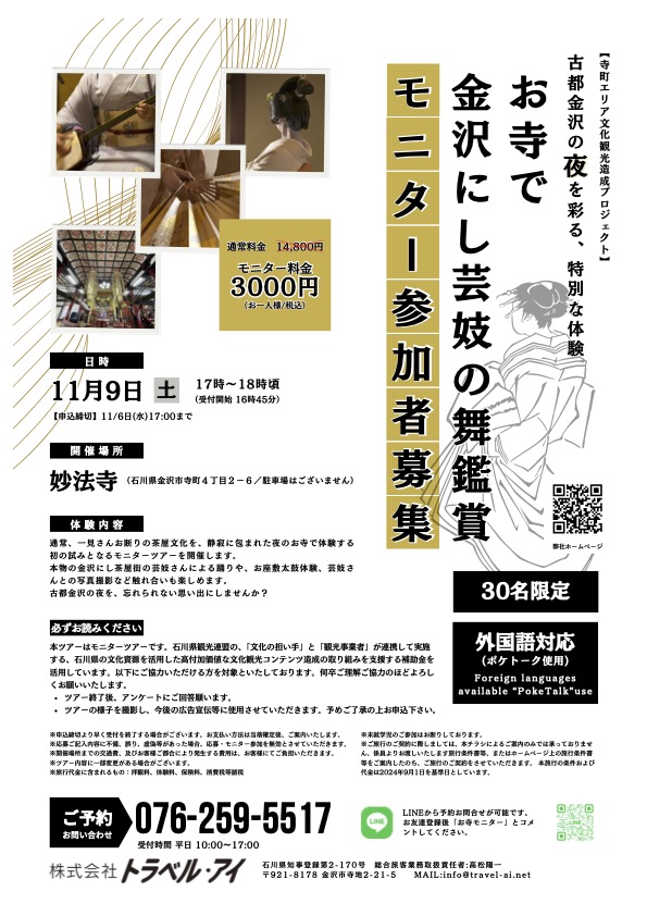 金沢三茶屋街のひとつ、にし茶屋街で、特別モニターツアーが開催される。通常“一見さんお断り”の茶屋文化を気軽に体験できる貴重な機会だ。にし茶屋街は、金沢における伝統的なおもてなしの聖地であり、数多くの芸妓が所属する地でもある。芸妓との触れ合いや特別な文化体験を通じて、金沢の独特な文化と歴史を深く知ることができる。 普段一般公開していない国の登録有形文化財『西検番事務所』にて、芸妓の優美な舞やお座敷太鼓体験を楽しみながら、「検番特製弁当」を堪能。さらに、「金沢寺町寺院群文化財特別公開2024」の一日拝観券が付属しており、お座敷ランチの後には寺院の文化財を観賞できる。また、ポケトークという小型通訳機も準備しているので、海外からの観光客もウェルカム。通常価格15,800円→5,000円/人で、限定30名の募集となっているので、気になる方は早めに申し込もう。芸術の豊かさと歴史の深さに触れるこの特別なツアーで、金沢の文化を全身で味わってみてはいかが。