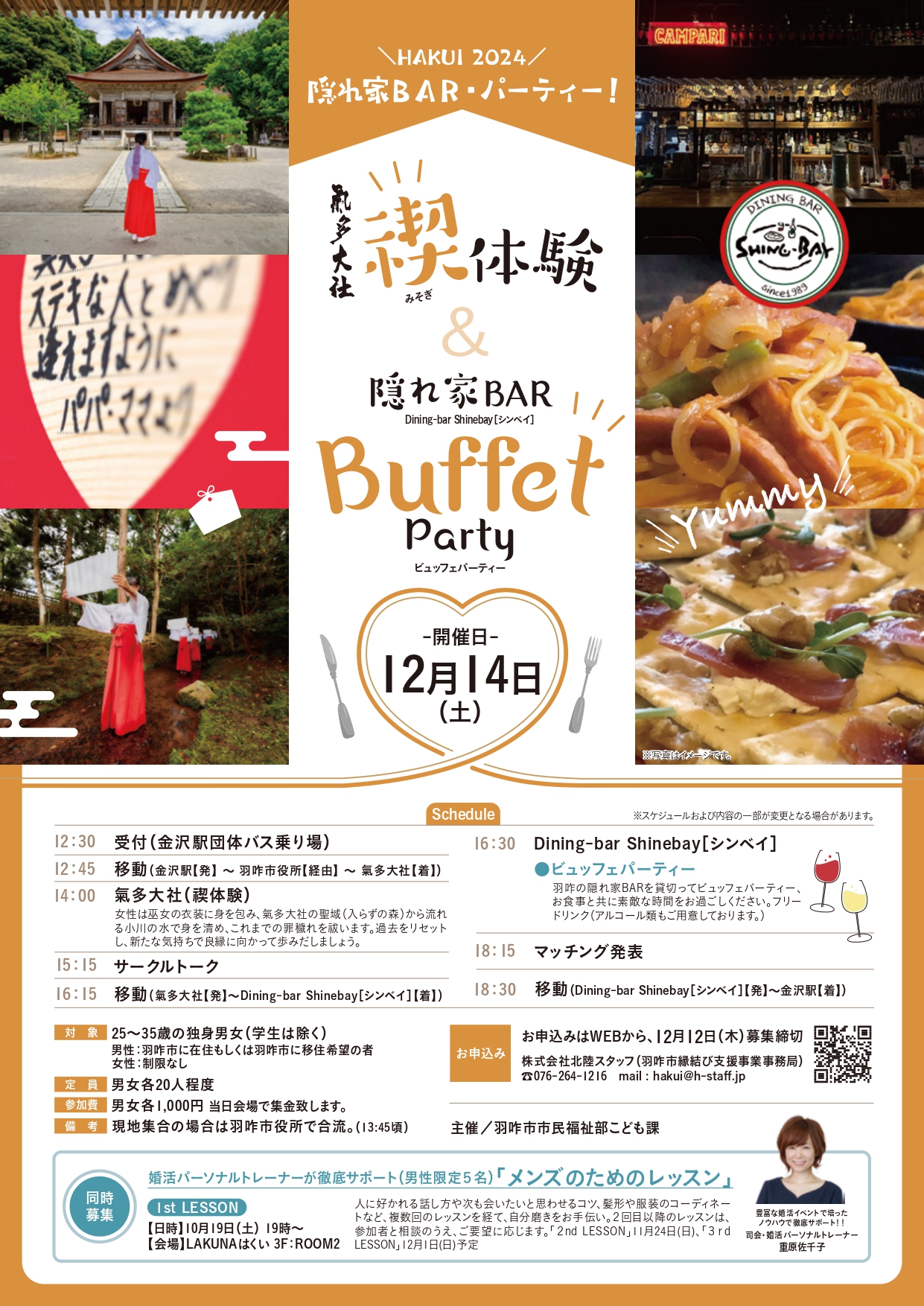 11月4日(月・祝)開催の第1弾では、「パンケーキ作り体験」とBBQパーティーが楽しめる。羽咋市の人気飲食店『地球知足』のオーナー直伝、羽咋市産米粉を使ったパンケーキ作り体験をした後は、『OUTDOOR RESORT HAKUI891(アウトドアリゾートハクイ)』へ移動。緑豊かなキャンプリゾートでは、フィンランドの伝統的なスポーツ「モルック」で体を動かしたり、リラックスした雰囲気の中で交流できる。12月14日(土)の第2弾は、気多大社への参拝からスタート。女性は巫女の衣装に身を包み、気多大社で聖域といわれる「入らずの森」から流れる小川の水で身を清め、これまでの罪穢れ(けがれ)を祓う。過去をリセットしてくれる禊(みそぎ)体験は、これまでにない貴重な機会になるはずだ。その後は羽咋の隠れ家BAR『シンベイ』を貸し切ってのビュッフェ・パーティー。神社で身も心もすっきりした後での会話は上質な大人の時間となるに違いない。
