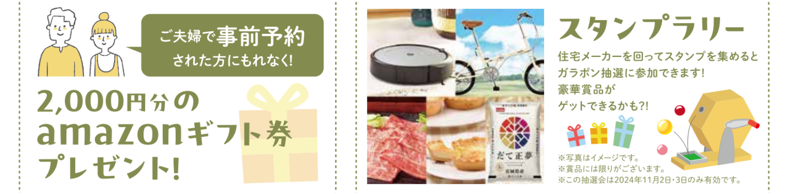 この他、夫婦で事前予約した人には、もれなく2,000円分の「amazonギフト券」がプレゼントされたり、参加住宅メーカーを回ってスタンプを集めると豪華景品の当選チャンスがあるガラポン抽選会に参加できたりと、今回も来場者特典が充実している。