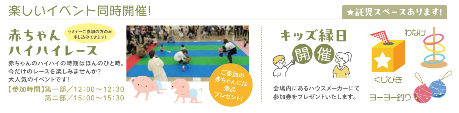 家族みんなで楽しく参加してほしいとお子様向けのイベントも同時開催。セミナー参加者の方のみが申し込める「赤ちゃんハイハイレース」(景品付き)や、くじ引き・わなげ・ヨーヨー釣りなどの「キッズ縁日」を実施する。託児スペースも完備しているので、安心して参加できるのも嬉しい。