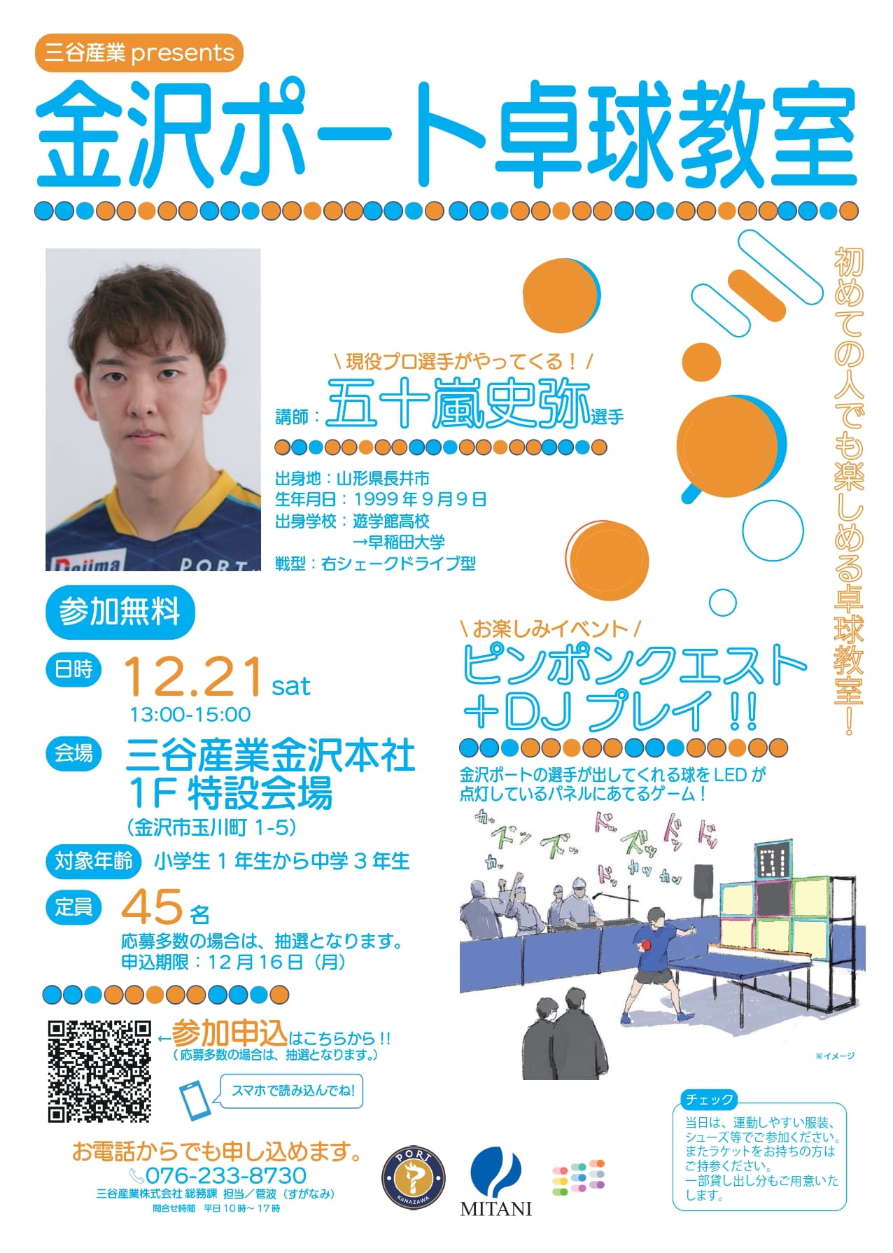 金沢市拠点のプロ卓球チーム「金沢ポート」の現役プロ選手2名と交流できるスペシャルイベント。