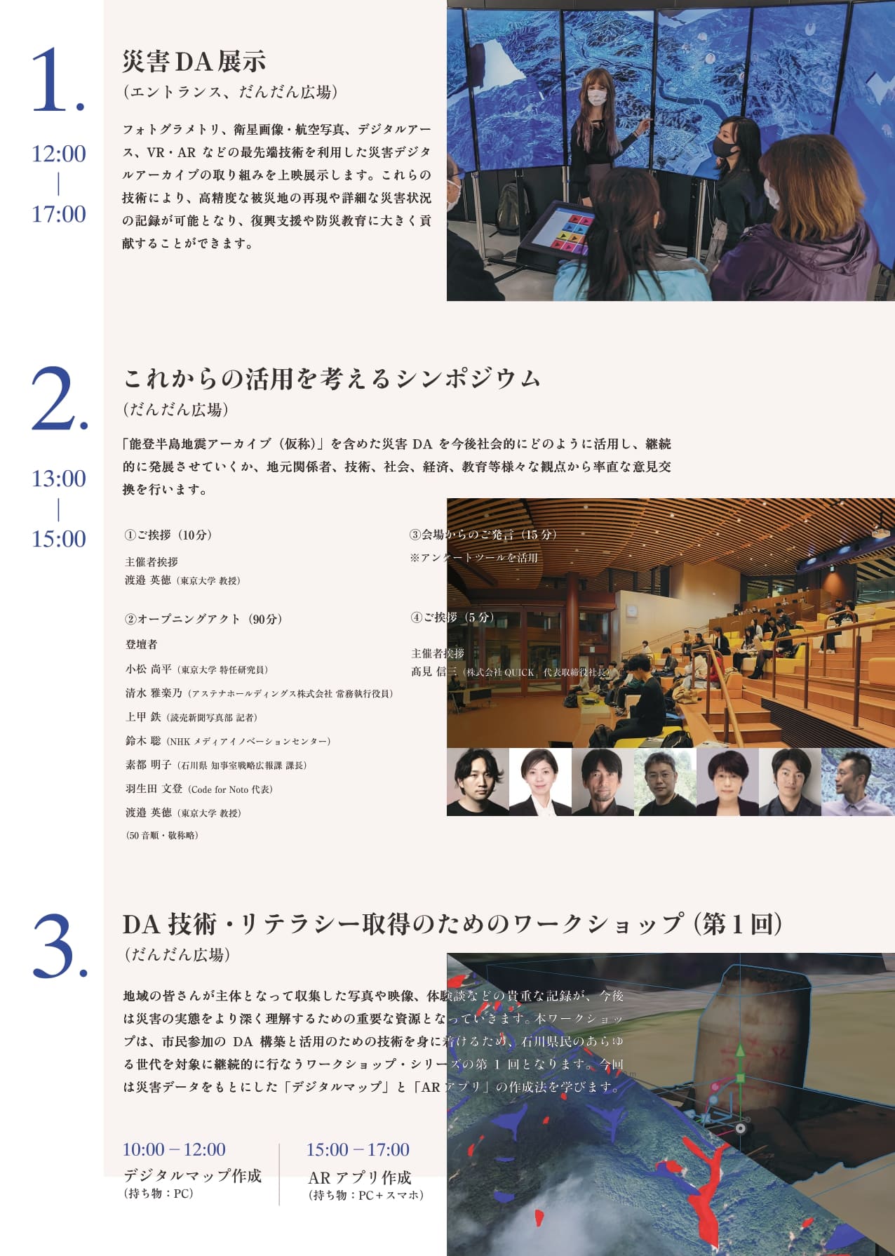 イベントでは、専門家を招いて災害デジタルアーカイブの今後の発展と活用について議論するシンポジウムや、フォトグラメトリやVR・ARなどの最先端技術を利用した展示、市民が参加できるデジタルアーカイブ技術やリテラシーを学ぶワークショップなどが行われる。参加無料。ワークショップは事前に応募・登録が必要なので、気になる方は早めに申し込みを。[PR]