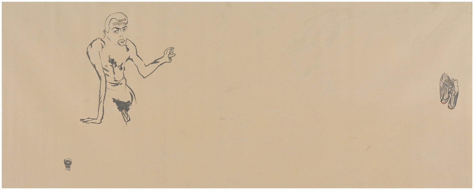 ・フランチェスコ・クレメンテ《 靴とグラスのある自画像》1979 墨、ガッシュ / 紙(リネン裏打ち)H202 × W497cm