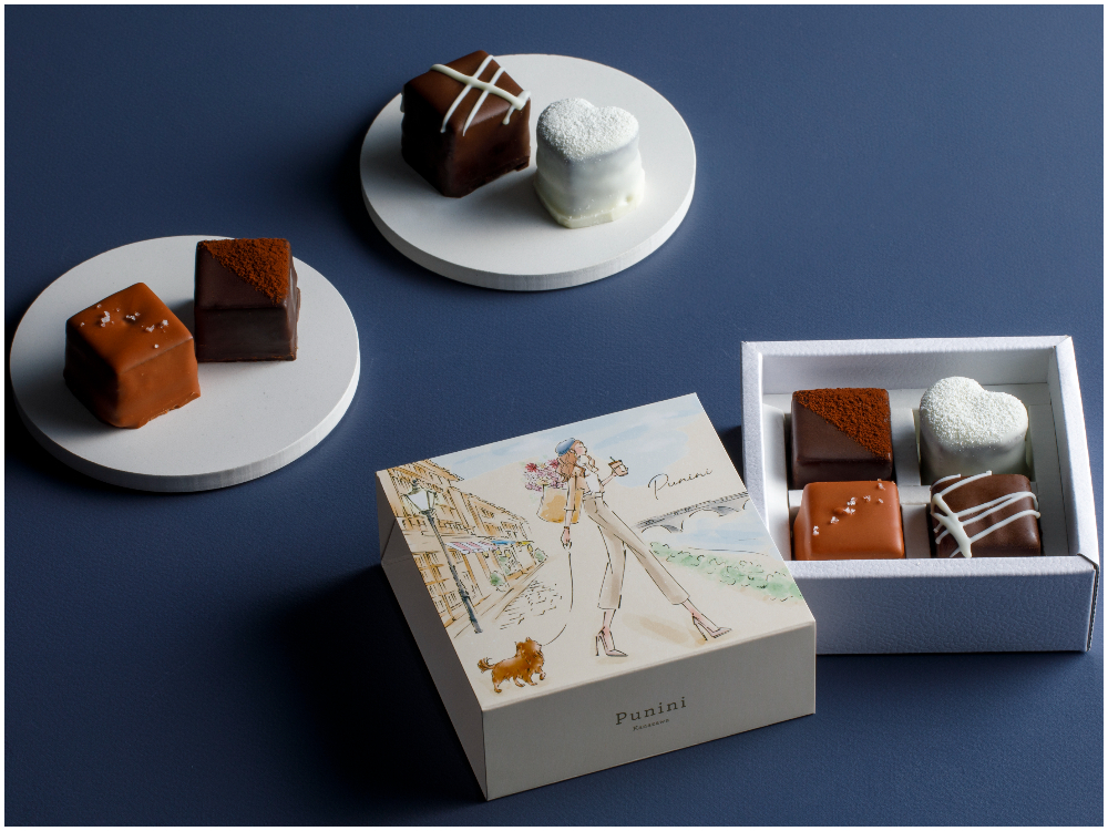 フレーバーは全部で4種類。「ガナッシュ」はレーズン調の酸味と重厚なカカオの風味が特長のなめらかなガナッシュをショコラ生地でサンド。苦み、酸味、甘味のバランスが絶妙だ。白いハートが可愛らしい「ブラン・ルージュ」は、自家製フランボワーズジャムが中にたっぷり詰まっている。「キャラメル」は独自の製法で仕上げた生キャラメルをショコラ生地と合わせた一品。トッピングのフランス産岩塩が更に美味しさを引き立てる。「プラリネ」は、芳醇な香りとコクが特長のプラリネクリームがショコラ生地と見事に調和。口に入れる瞬間に広がる香ばしいアーモンドの香りが印象的だ。フレーバーは4種固定となっているので、それぞれ一つずつ楽しむことができる。金沢の「主計町茶屋街」とパリのセーヌ河岸をイメージした限定パッケージは、洗練された美しさでギフトにも最適。3月1日(土)~3月16日(日)の期間限定で販売なので、気になる方は早めに予約を。詳細は公式サイトをチェックしよう。