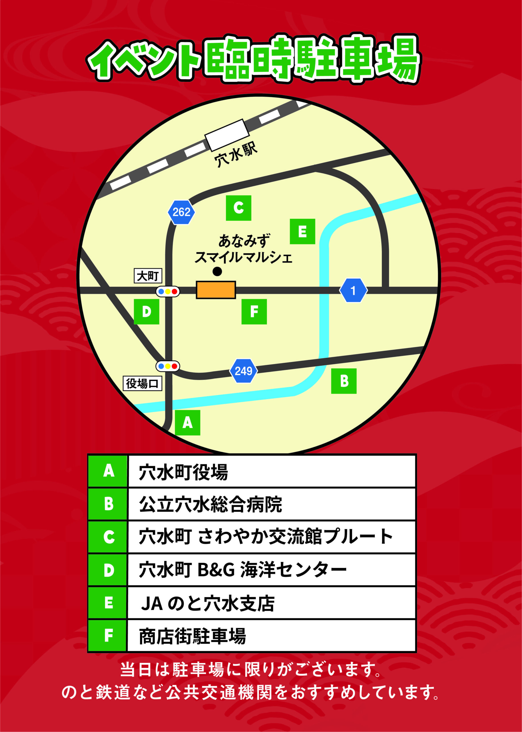 - イベント臨時駐車場あり※台数に限りがあるため、公共交通機関をおすすめしています