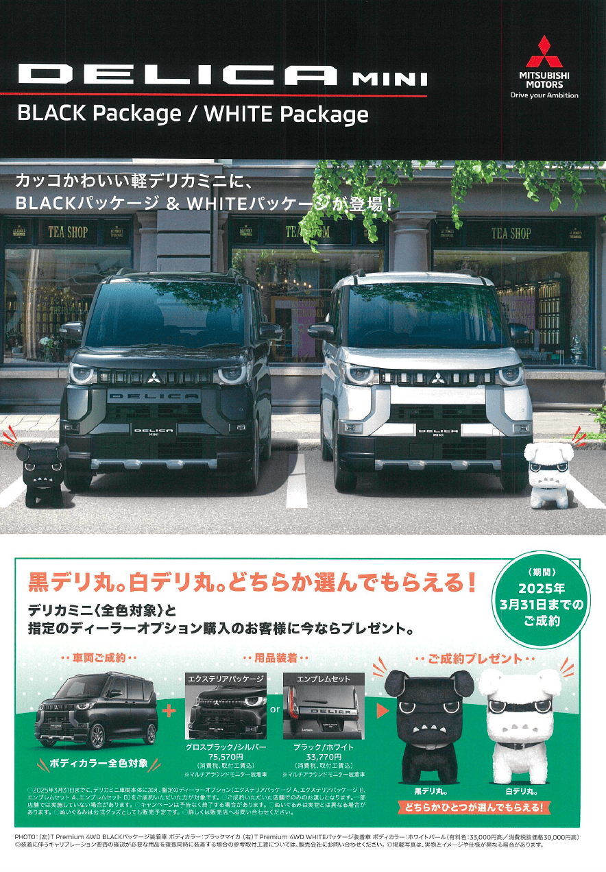今回のフェアでは、7人乗りミニバンの「デリカD:5」、逞しいボディと快適性が魅力のピックアップトラック新型「トライトン」、コンパクトSUV「エクリプスクロスPHEV」に加え、デリ丸のCMで話題の軽自動車「デリカミニ」まで、幅広いラインナップを展示。即納可能な在庫車も多数用意しており、新生活のスタートに合わせた納車にも対応可能だ。3月31日までにデリカミニと指定のディーラーオプション(エクステリアパッケージもしくはエンブレムセット)購入のお客様に黒デリ丸。白デリ丸。のどちらかの等身大ぬいぐるみをプレゼント。