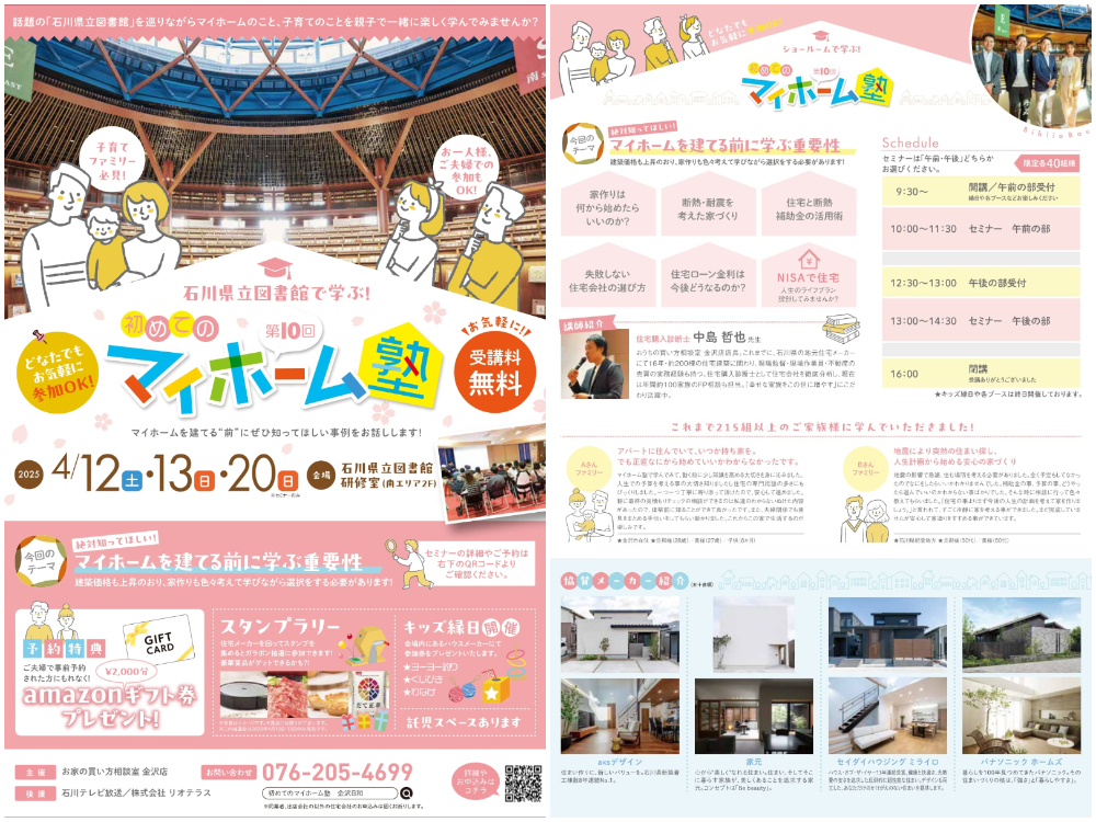 「そろそろ家を建てたいけれど、建築価格も上がっているし、何から始めたらいいのかな」。そんなお悩みをお持ちの方におすすめのセミナー「マイホーム塾」が、4月12日(土)・13日(日)・20日(日)に『石川県立図書館』で開催される。住宅に対する不安をさまざまな切り口で解決してくれるとあって、毎回好評を得ている。