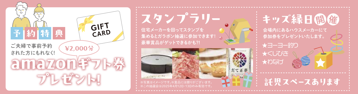 2022年の第1回開催から数えて、215組以上の家族が参加。10回目となる今回も住宅購入診断士の中島哲也さんが講師となり、「マイホームを建てる前に学ぶ重要性」をテーマに分かりやすくレクチャーしてくれる。「断熱・耐震を考えた家づくり」や「失敗しない住宅会社の選び方」、「住宅ローン金利は今後どうなるのか? 」など、家を建てる前に知っておきたい6つのポイントを伝授。また、家族みんなで楽しく参加できるようにと、ヨーヨー釣り・くじびき・輪投げなどの「キッズ縁日」も開催される。託児スペースもあるので、小さなお子様連れも安心だ。ご夫婦で事前予約した人には、2,000円分の「Amazonギフト券」をもれなくプレゼント。そのほか、住宅メーカーを回ってスタンプを集めると豪華景品の当選チャンスがあるガラポン抽選会に参加できる。(抽選会は4月12日(土)・13日(日)のみ)。