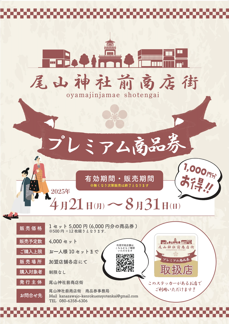 1,000円もお得!尾山神社前商店街プレミアム商品券、好評販売中。