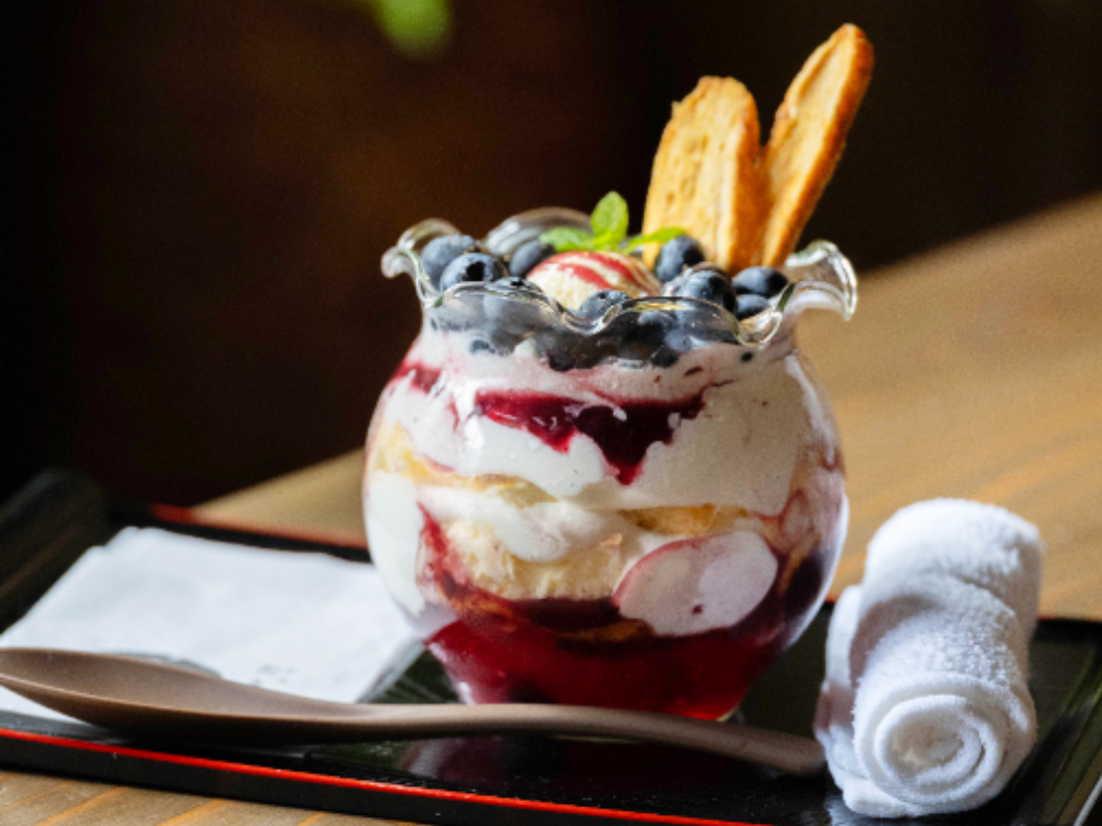 7月1日(火)からは、旬を迎える県内産ブランドブルーベリーをたっぷり使った「たもんのブルーベリーパフェ(数量限定)」が登場。みずみずしいフレッシュブルーベリーと、なめらかなチーズクリームの組み合わせが絶妙で、コクがありながらもさっぱりとした味わいに。この時期だけの限定スイーツを堪能したい。