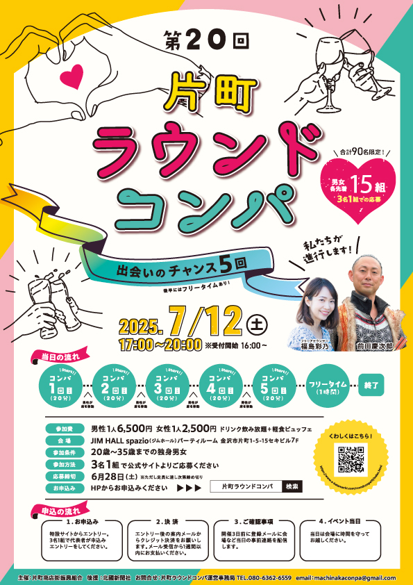 この夏も片町が出会いの主役に。いよいよ第20回を迎える「片町ラウンドコンパ」が、7月12日(土)に開催される。男女各15組限定の少人数制だから、しっかり話せて、フィーリングも伝わりやすいと毎回大好評のイベントだ。