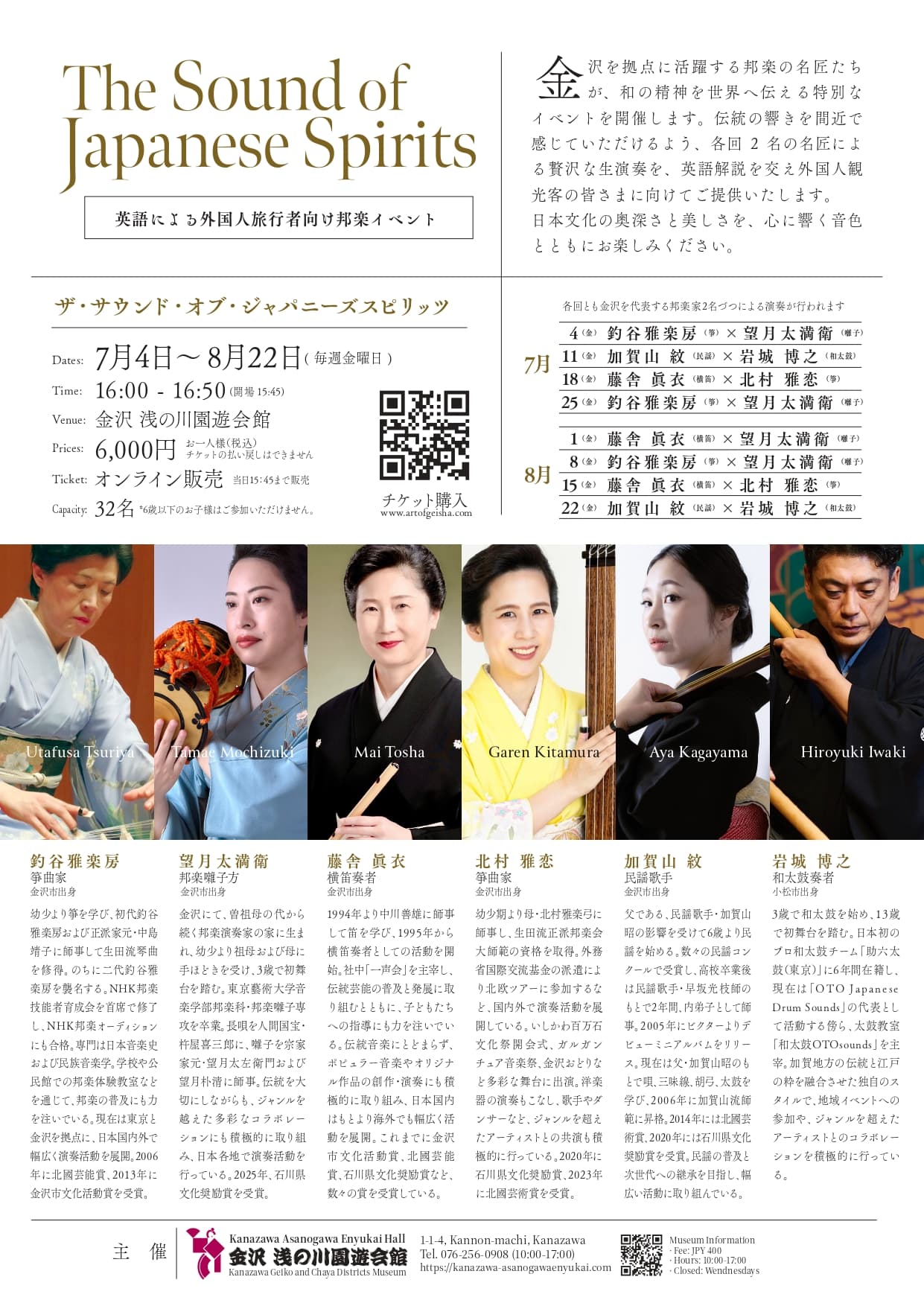 会場は、茶屋文化の風情が漂う「金沢 浅の川園遊会館」。各回2名の演奏家がタッグを組み、日本古来の音色を臨場感たっぷりに届ける。五感に響くその音楽体験は、ただの鑑賞を超えて、日本文化の奥深さと精神性にふれる時間となるだろう。