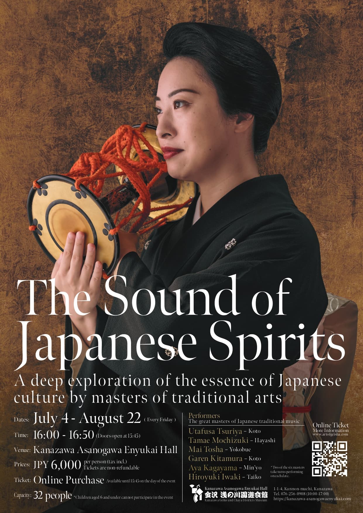 この夏、金沢から世界へーー。日本の伝統音楽の真髄を届ける、特別なステージが開かれる。出演するのは、箏曲、横笛、民謡、和太鼓、邦楽囃子といった各ジャンルを代表する演奏家たち。金沢を拠点に全国で活躍し、確かな技と表現力を備えた名匠たちが集い、外国人旅行者に向けて英語解説付きで演奏を繰り広げる。