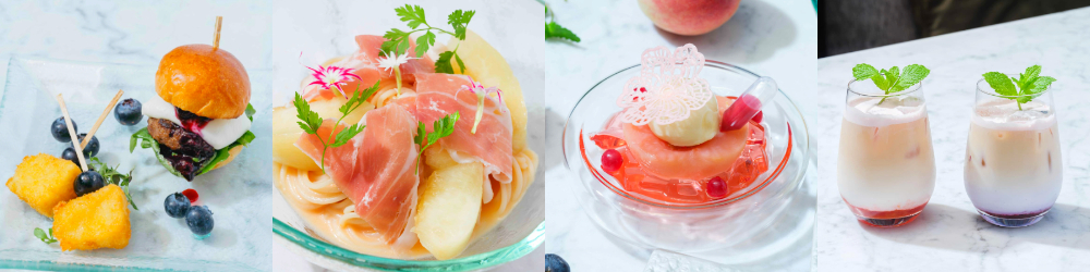 ラインナップは、ふわふわスポンジに上品な甘さの桃を重ねた「桃のショートケーキ」や、ラズベリーを添えた爽やかな「パンナコッタ 桃とベルベーヌジュレ」、もちもちのベーグルにブルーベリーとクリームチーズをサンドしたミニベーグルなど、見た目も可愛らしく夏らしいスイーツが並ぶ。さらに、能登牛×モッツァレラ×ブルーベリーソースが絶妙にマッチしたスライダーバーガーや桃とハモンセラーノを合わせた冷製カッペリーニなど、セイボリーも食べ応え十分。
