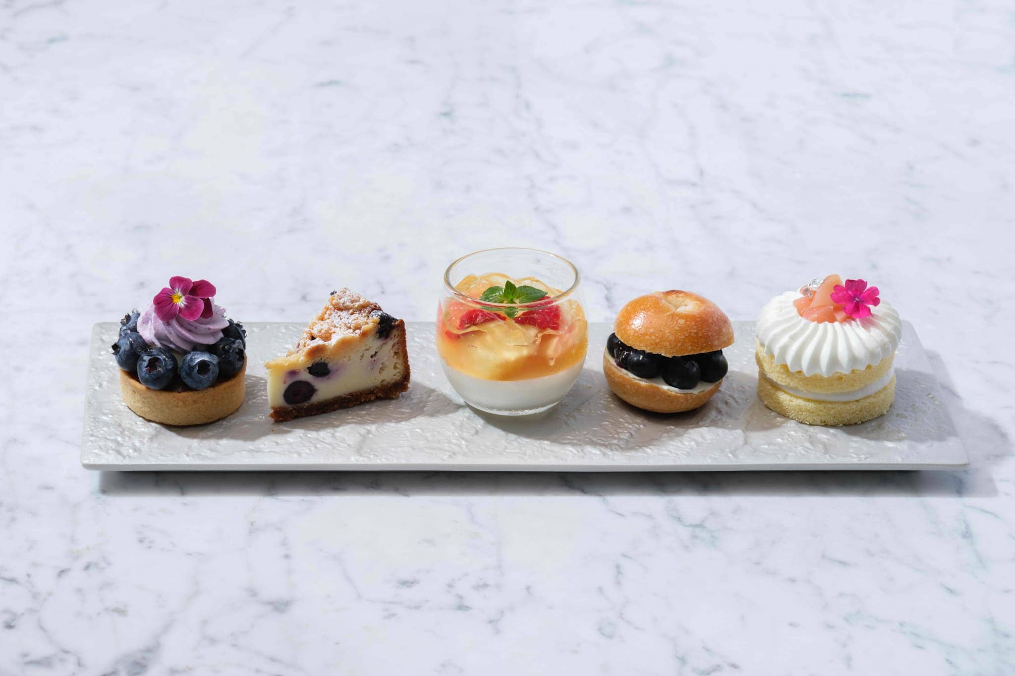 桃のショートケーキ、ブルーベリーミニベーグル、パンナコッタ 桃とベルベーヌジュレ、ブルーベリーチーズケーキ、ブルーベリータルト、ピーチメルバ
